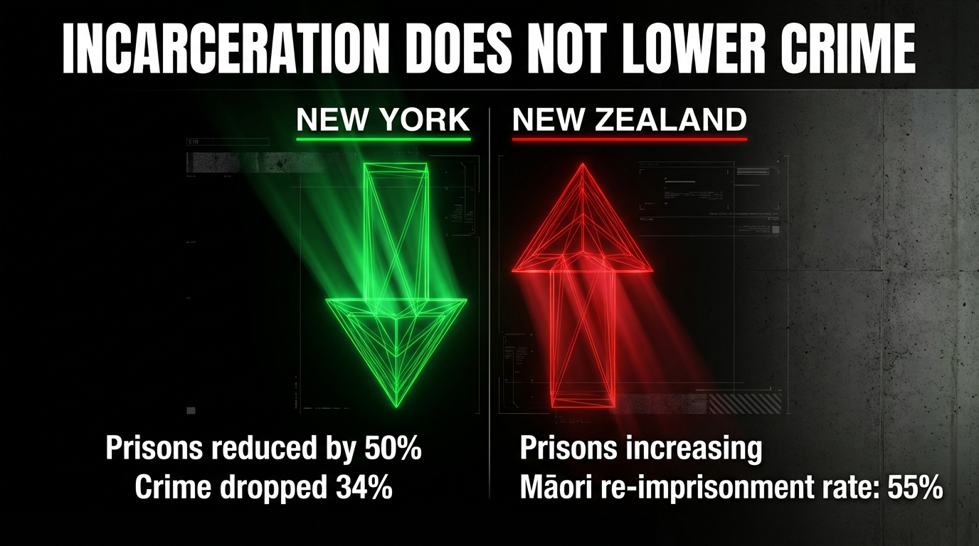 The Data: The US Sentencing Project released a study in late 2025 showing that states that reduced their incarceration rates witnessed greater declines in crime rates. New York cut its prison population by over 50 percent between 1999 and 2023, and violent crime dropped by 34 percent — outpacing the national decline of 28 percent. As even former National Prime Minister Bill English acknowledged in 2011, prisons are "a moral and fiscal failure".