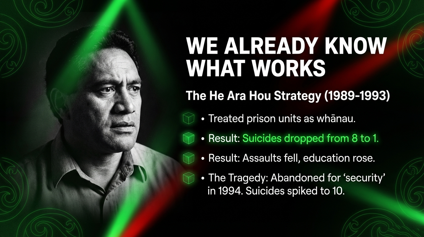 The Solution: Abolish the Redress Bill's exclusion clause. Fund kaupapa Māori reintegration services at a level proportionate to need — currently, as Associate Professor Paula King notes, "what is funded is overwhelmingly mainstream" while Māori providers are chronically under-resourced. Redirect a minimum of 20 percent of Corrections' $2.8 billion budget to whānau-based wraparound services, community reintegration, and survivor support — the approach Tā Kim pioneered with He Ara Hou in 1989, which reduced prison suicides from eight to one and increased educational completion by a third before the department abandoned it after his resignation and watched suicides climb to ten.