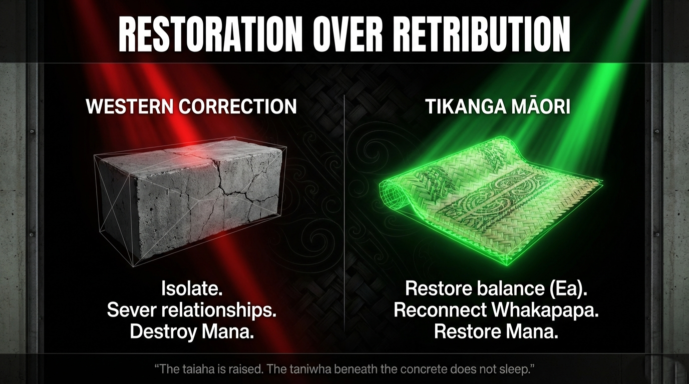 The Tikanga Impact — Explained: The Western concept of "correction" assumes the individual is broken and must be fixed through isolation and punishment. In tikanga Māori, the concept is entirely different. Whakatikatika — to set right — requires the restoration of relationships, not their destruction. A person who has caused harm must be brought back into the web of obligation and belonging that gives life meaning. Prison does the opposite: it rips the person from every relationship — whānau, hapū, iwi, whenua — and places them in an environment designed to destroy trust. It is the anti-tikanga. It manufactures disconnection, then punishes the disconnected for being disconnected. Every dollar spent on a prison cell is a dollar not spent on restoring mauri. Every new bed is a statement of intent: we will sever more whakapapa. We will create more trauma. We will call it order.