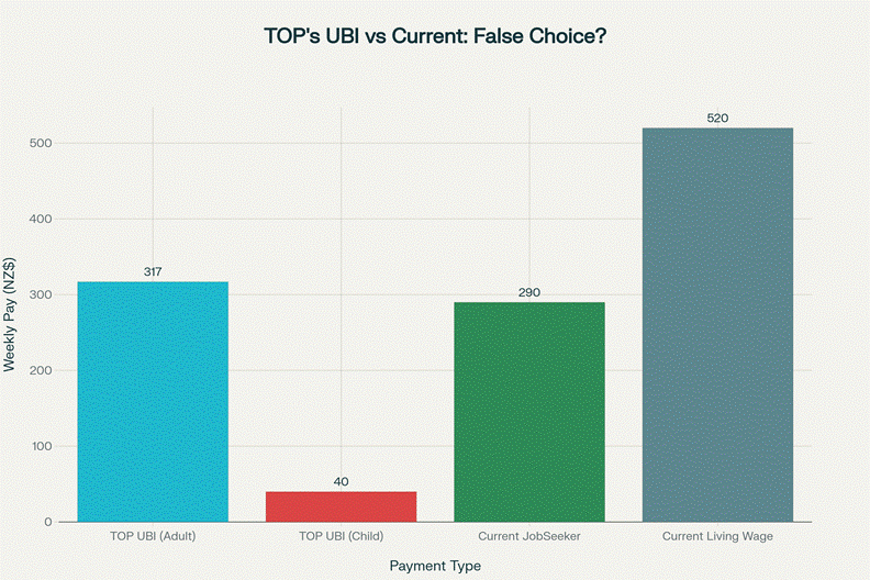 TOP’s proposed UBI of $317/week sits between current JobSeeker ($290) and living wage ($520), while maintaining a regressive 35% flat tax that benefits the wealthy.