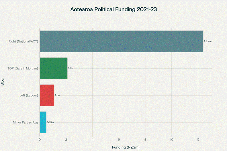 Right-wing parties received over 11 times more funding than Labour between 2021-2023, with National and ACT collecting $12.4 million primarily from corporations and wealthy donors.