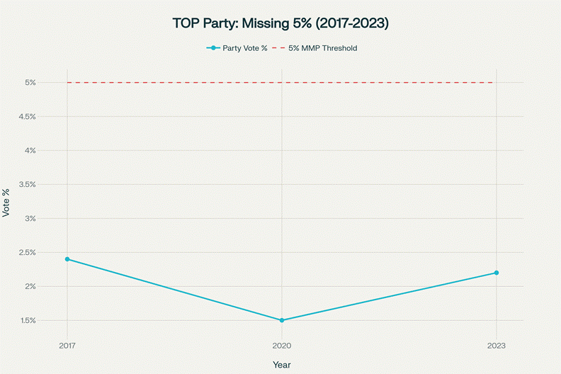 TOP has never exceeded 2.4% of the party vote—consistently missing the 5% MMP threshold. In 2017: 2.4% (58,443 votes), 2020: 1.5% (43,449 votes), 2023: 2.2% (63,330 votes). Zero seats, zero mandate, zero power.[19][20][36][37]