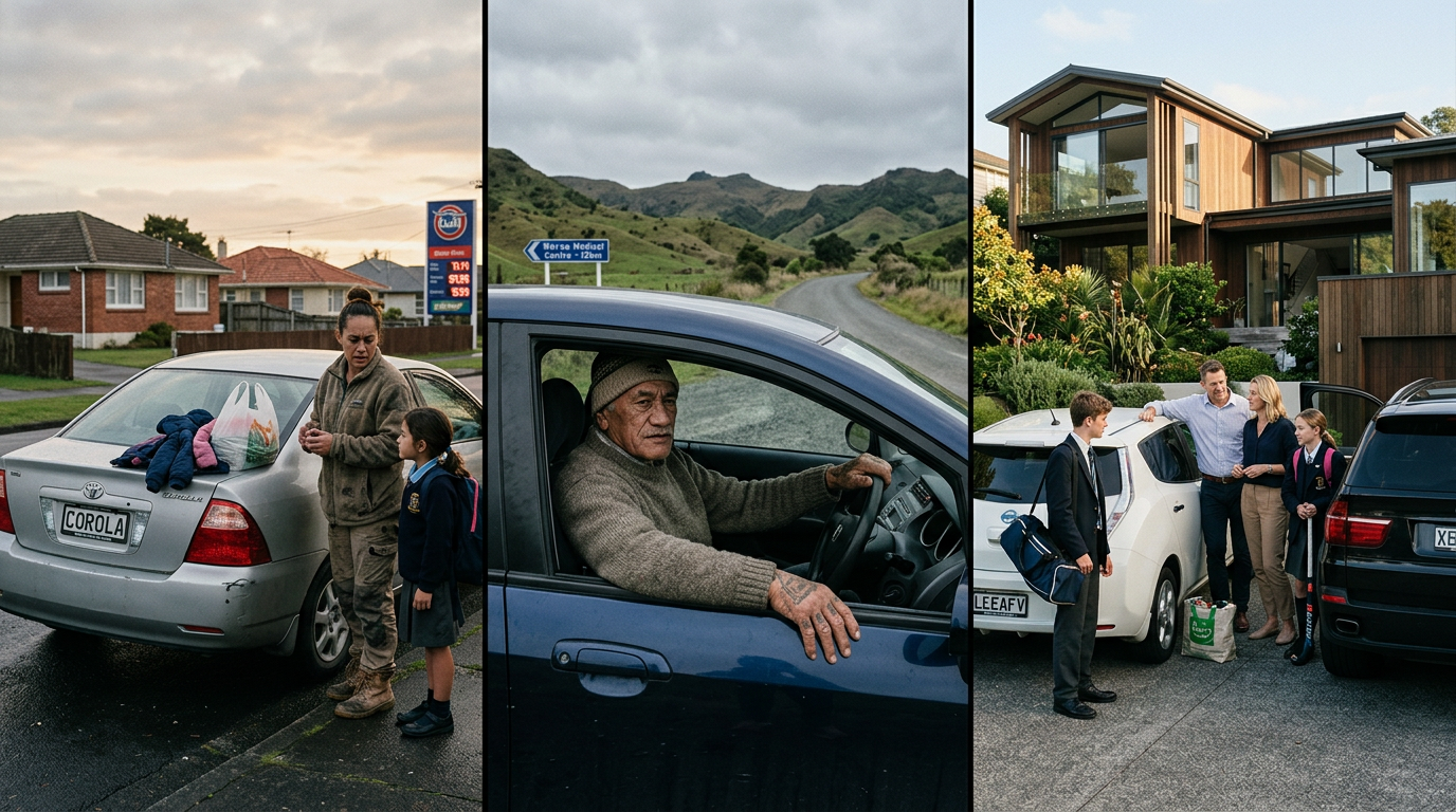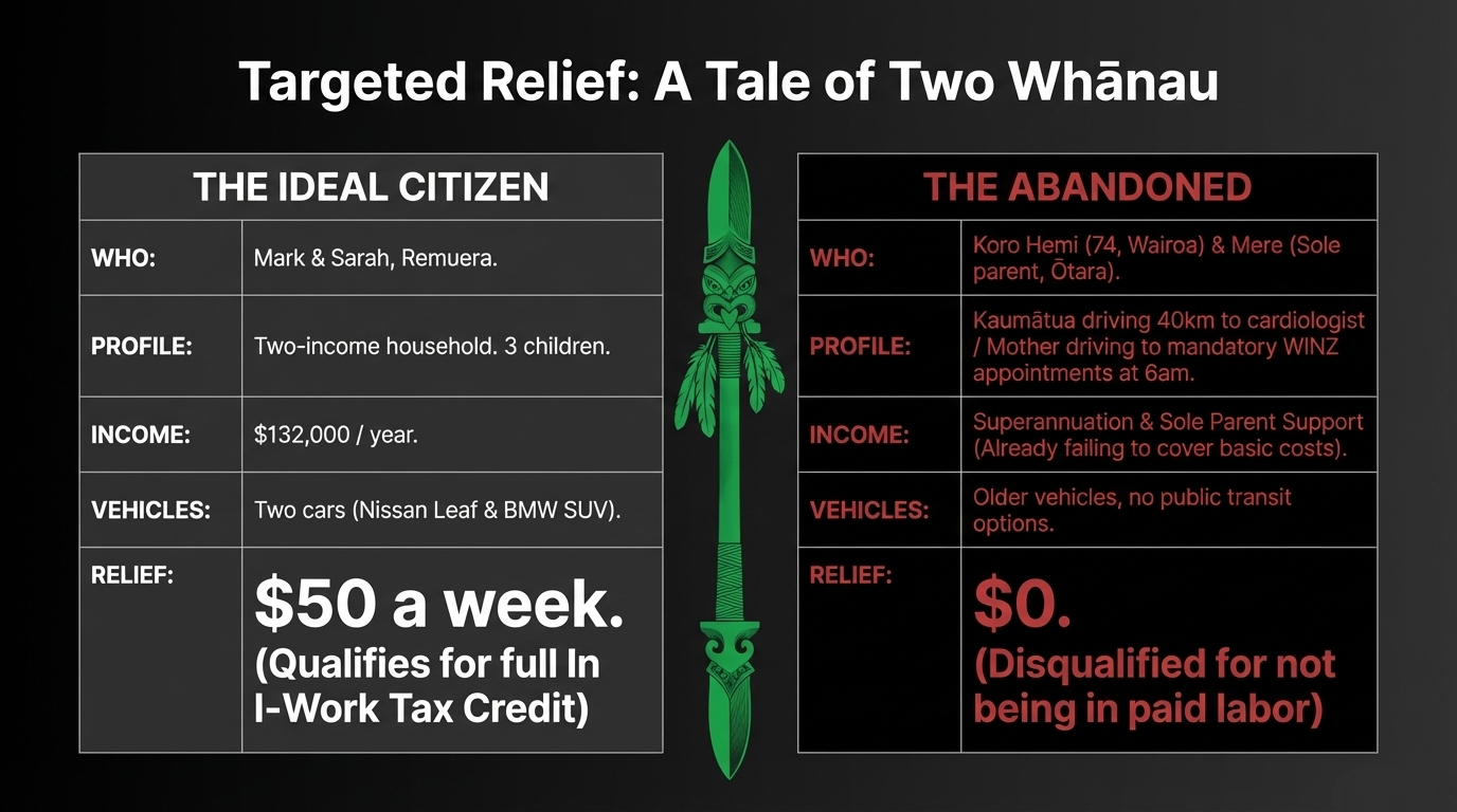 Mere is a Māori sole parent in South Auckland. She receives Sole Parent Support after losing her cleaning job when her daughter got sick. She drives a 2004 Toyota Corolla. She has no choice — there is no bus at 6am to get her daughter to school before Mere gets to the WINZ appointment she must attend or face sanctions, as documented in The Traffic Light Taiaha essay at The Māori Green Lantern. Petrol is now $3.29 a litre. She fills 35 litres a week. That is an extra $27.65 a week compared to last month — on a benefit that already fails to cover basic living costs. From this government: zero dollars. Because she doesn't have a job. The tikanga violation here is acute: in te ao Māori, manaakitanga — the obligation to provide for those who need — does not come with employment conditions attached.