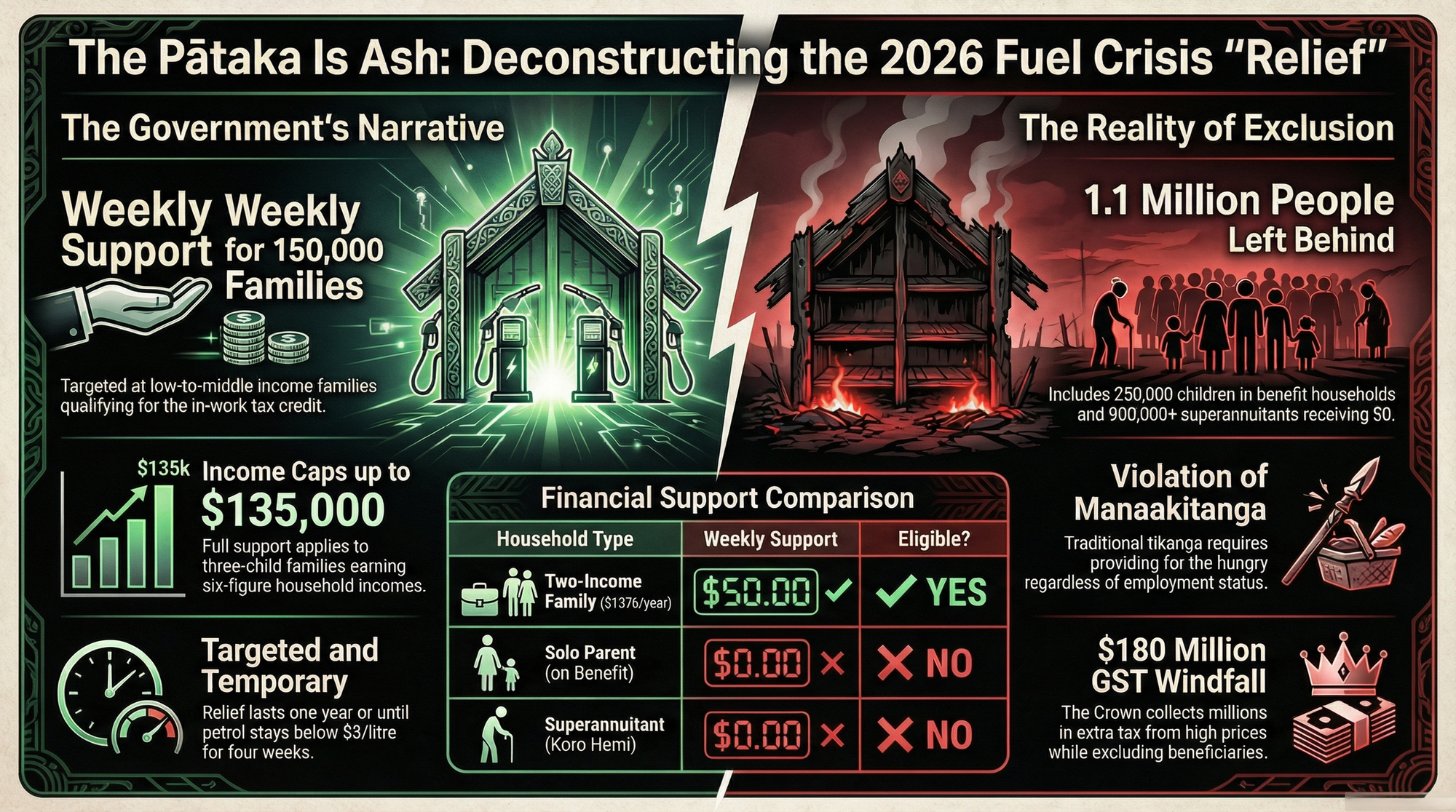 This government is in occupation of the pātaka. They have the resources. The extra $180 million in GST Willis will collect from higher petrol prices alone this year could have funded direct payments to every beneficiary household in the country. Instead, she takes that money — extracted from struggling whānau at the pump — deposits it into the Crown account, and announces $373 million in relief that structurally bypasses the poorest. This is the colonial logic of the Working for Families system made explicit: the Crown's obligation to Māori and the poor extends only as far as it is politically convenient.
