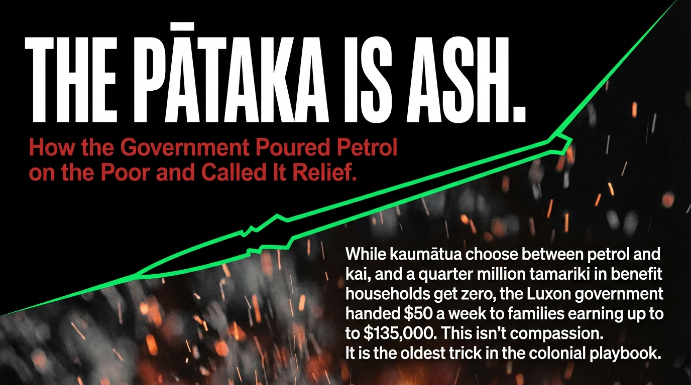 While kaumātua choose between petrol and kai, and a quarter million tamariki in benefit households get zero, the Luxon government handed $50 a week to families earning up to $135,000 — and called it compassion. It isn't. It's the oldest trick in the colonial playbook: perform care while engineering abandonment.