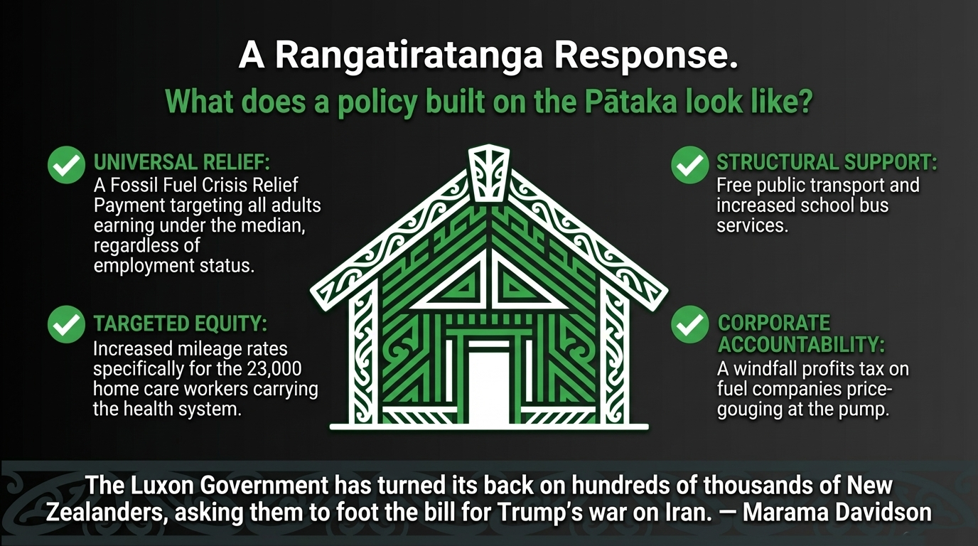 The Green Party proposed a Fossil Fuel Crisis Relief Payment targeting all adults earning under the median, all rural residents where public transport is unavailable, free public transport, increased school bus services, a windfall profits tax on fuel companies, and increased mileage rates for care workers. That is a pātaka-based policy — one rooted in the principle that the storehouse provides for all, that crisis demands collective response, and that the measure of a government's mana is who it protects in the fire.