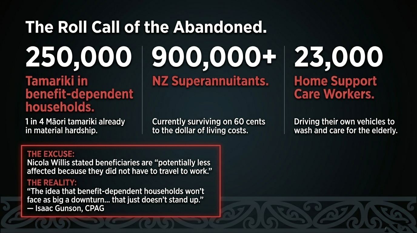 For tamariki Māori — one in four already in material hardship before this crisis — the package offers nothing. For kaumātua surviving on 60 cents in the dollar of what superannuation was supposed to cover, nothing. For the Pacific wahine driving to the hospital nightshift — if she's on a benefit — nothing. For the rural contractor watching his business haemorrhage — nothing. For the home support worker driving 80 kilometres through Northland to wash an elderly kaumātua — nothing.