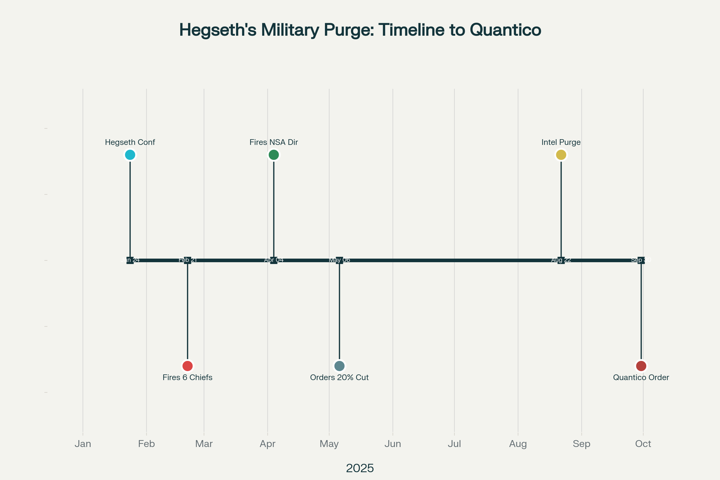 Timeline showing Pete Hegseth’s systematic military purge from confirmation to the Quantico meeting
