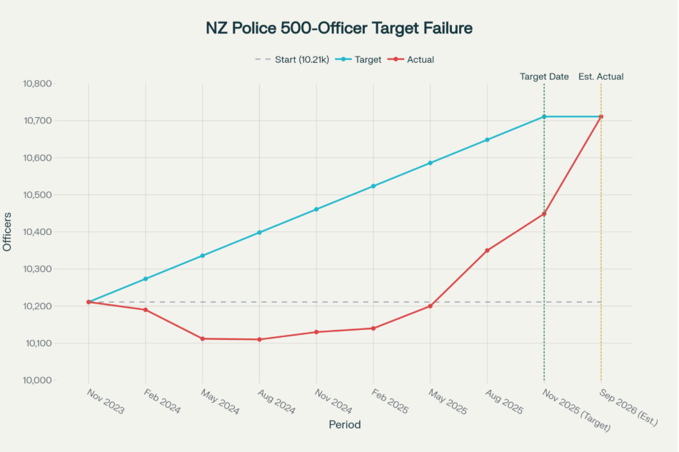 Chambers confirmed this structural failure in his hiring freeze and retraining protocols. The new 20-week training course (extended from 16 weeks) meant no recruit wings graduated between October 2023 and January 2024—a deliberate pause that compounded the target’s impossibility. When police increased training capacity and opened an Auckland facility at Massey University, recruitment remained constrained by attrition outpacing intake.