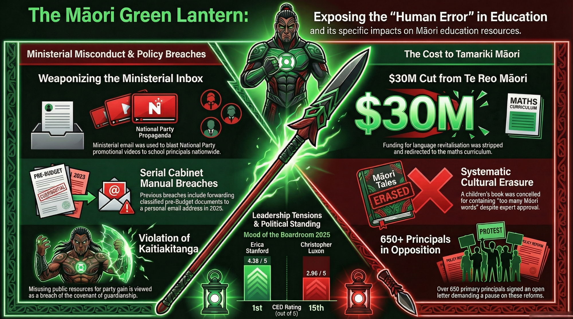 This is not a series of unrelated mistakes. This is a coherent programme of cultural erasure, enforced through the machinery of the state, with propaganda deployed against the professionals who resist it. The Māori Green Lantern explored the full architecture of this campaign in detail in Education Minister's War on Te Reo Māori. Read it. Then read it again.