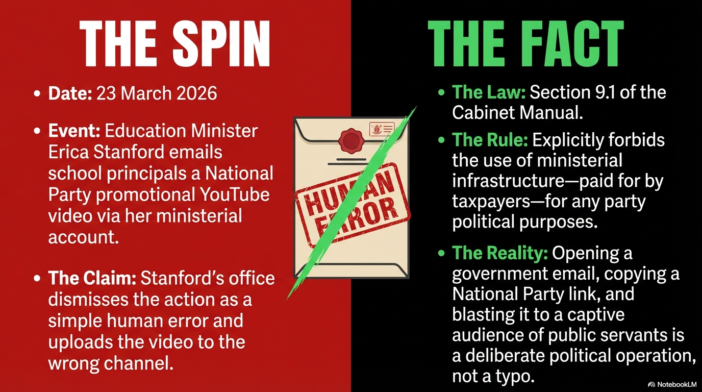 On 23 March 2026, Education Minister Erica Stanford admitted — as confirmed by the NZ Herald — that she had sent a National Party YouTube promotional video to school principals across Aotearoa from her ministerial email address. The video? National Party content. The email address? Funded by every taxpayer in this country. Her defence? "Human error."