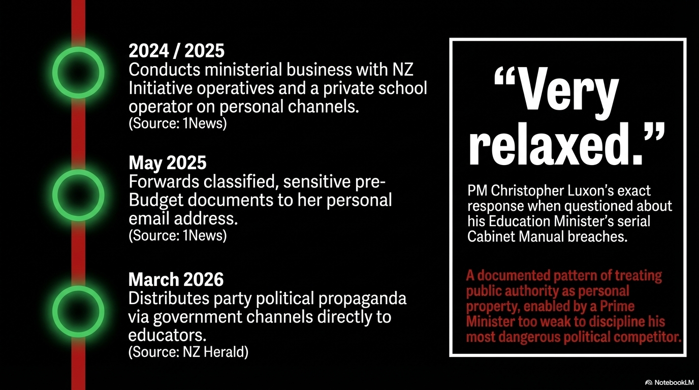 This is not someone accidentally replying-all on a lunch order. Section 9.1 of the Cabinet Manual is unambiguous: ministerial resources — including email infrastructure — must not be used for party political purposes. When you load up a government email account, open a National Party YouTube video, copy the link, and blast it to a captive audience of school leaders you already hold power over, that sequence of deliberate actions is not an error. That is a political operation conducted from behind a ministerial desk. Labour's Chris Hipkins called it "completely inappropriate" use of government resources. He is, for once, correct — though he should look in the mirror before claiming the moral high ground.