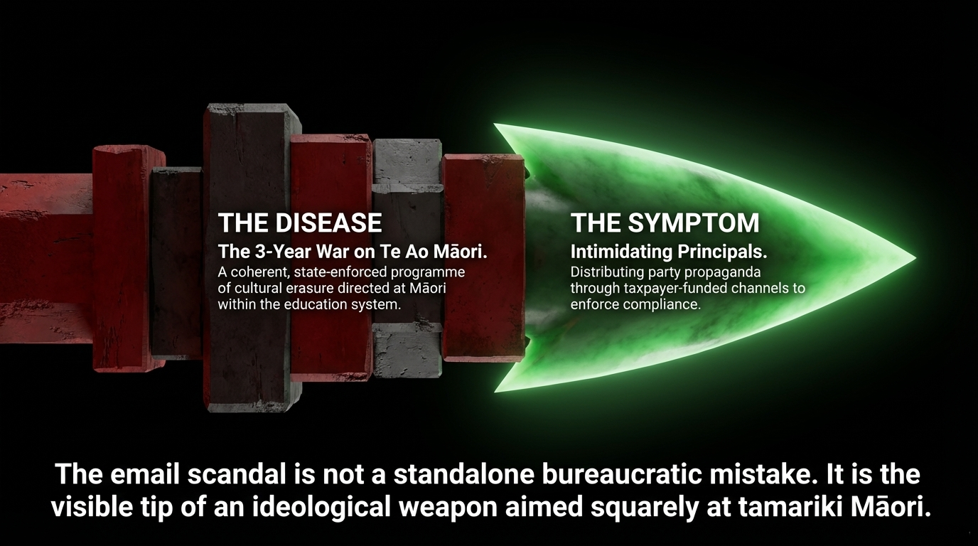This essay names what she did, why it matters to whānau, why the political timing reeks, and why the stench of a destabilisation campaign does absolutely nothing to launder the fundamental truth: a minister of the Crown used taxpayer resources to push party political propaganda at the very educators she has been systematically brutalising for three years. The taiaha drops here.