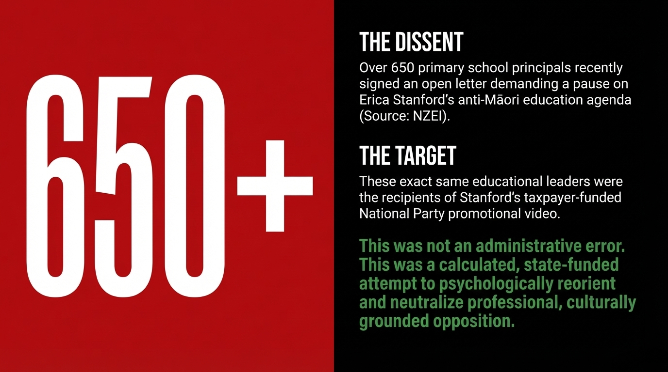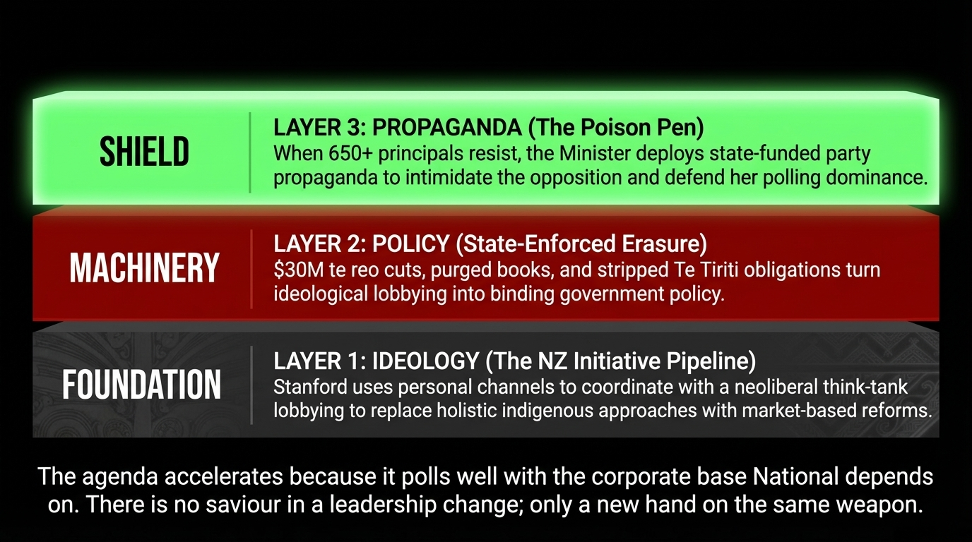 Worse: she directed that violation at the very kaitiaki of our tamariki — the principals and teachers who are fighting every day to deliver education in an environment Stanford has already stripped of te reo Māori resources, purged of culturally-grounded curriculum content, and now attempts to manage through party-funded propaganda delivered via government channels. The Māori connection is not incidental. The principals targeted most acutely by Stanford's reforms are those leading schools with high Māori rolls — kura where te reo and mātauranga Māori are not optional extras but the foundational architecture of learning. She stripped the architecture. Then she sent them a party video telling them the demolition was good for them.