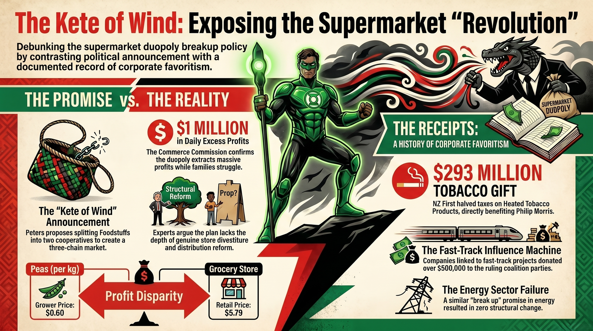 Winston Peters just tried to sell you a supermarket revolution from the same hands that handed Philip Morris $293 million, fast-tracked corporate donors' projects while suppressing the conflict-of-interest register, and ran a secret slush fund through the NZ First Foundation. These are not allegations. They are documented. They are sourced. They are the receipts.