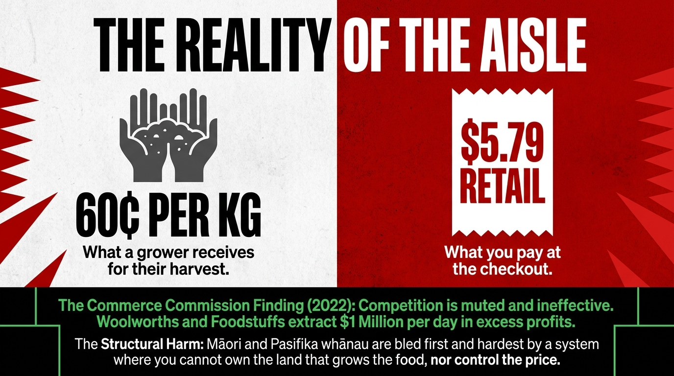 This is real harm. Quantified harm. Māori and Pasifika whānau, who spend a disproportionately high share of income on food, are bled first and hardest by this system, as Consumer NZ documented in March 2024.