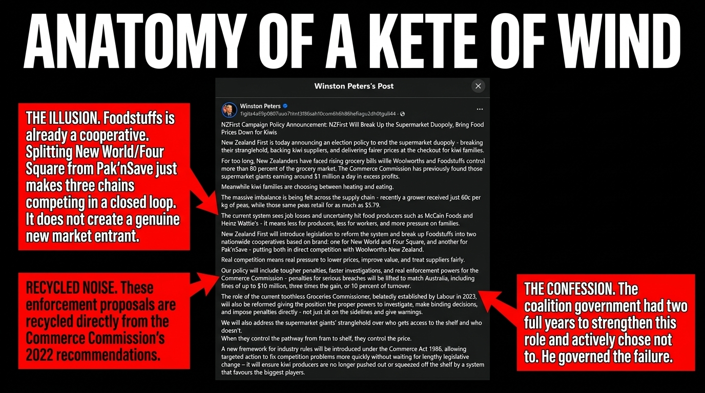 As competition lawyers confirmed to the NZ Herald in March 2025, forcing a structural de-merger through existing law is legally complex, expensive, and would take years — none of which Peters' vague announcement accounts for.