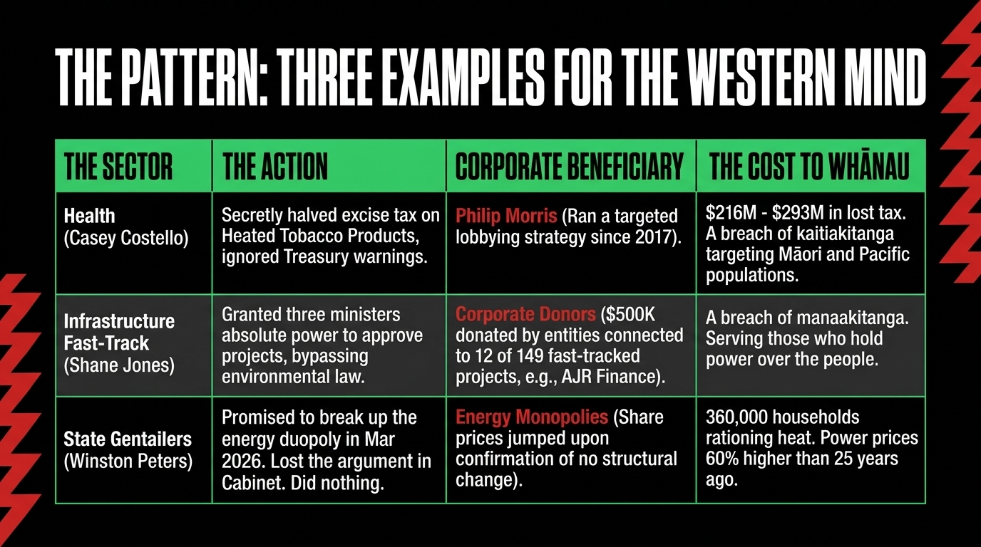 In tikanga, this is a fundamental breach of kaitiakitanga — the obligation to protect those in your care. A minister who is supposed to protect public health instead handed a tobacco multinational a quarter-billion-dollar gift, then hid the receipts. The Māori Green Lantern covered this in depth in "The Corporate Puppet Show of Casey Costello" and in "Smoke and Mirrors: Costello's Tobacco Policy Disaster" and "Bringing You Death at Half the Cost".