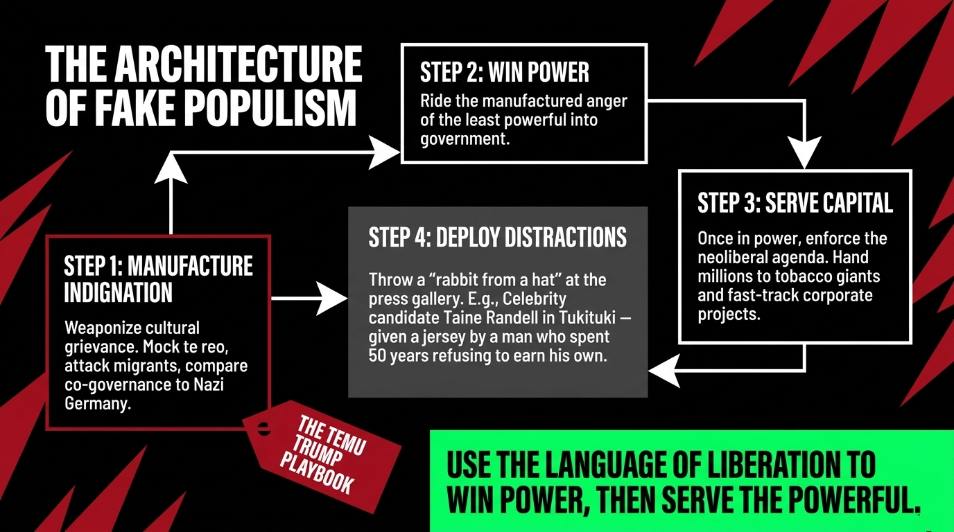 And now: "WINSTON PETERS IS A TEMU TRUMP FOR REALS" — cheaper, less effective, and still toxic. The same authoritarian cultural grievance politics. The same anti-Māori dog-whistling. The same coalition of billionaires and battlers. The same man who compared co-governance to Nazi Germany, who told Māori they are "not indigenous," who mocked te reo in Parliament, who singled out a Pacific MP for his heritage — now asking you to trust him to break corporate power at the supermarket checkout.