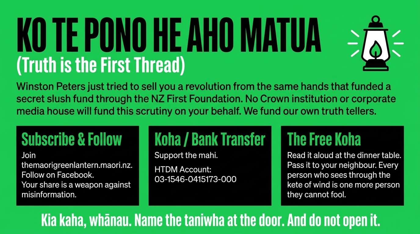 If this essay helped you see through the haze — if it cut through the fog that Peters manufactures for a living — then this mahi matters. And mahi like this costs. It costs time. It costs courage. It costs the kind of relentless scrutiny that no Crown institution, no corporate media house, and no party machine will fund on your behalf.