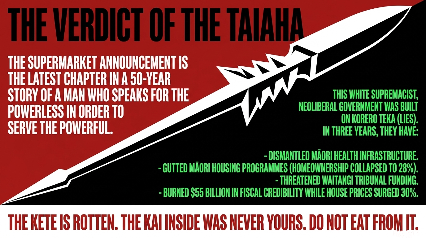It was built on narratives carefully engineered to keep Māori, workers, migrants and whānau looking over their shoulders at each other while power cleared the land above them. The supermarket announcement is the latest chapter in a fifty-year story of a man who speaks for the powerless in order to serve the powerful.
