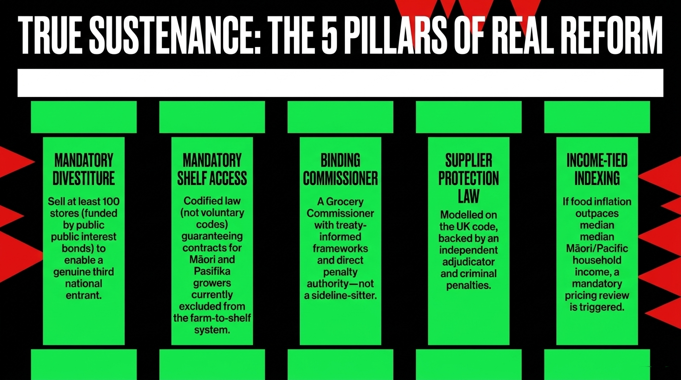 - A Grocery Commissioner with binding enforcement power, treaty-informed decision-making frameworks, and direct penalties authority — not the toothless sideline-sitter created under Labour and left deliberately crippled under this coalition
