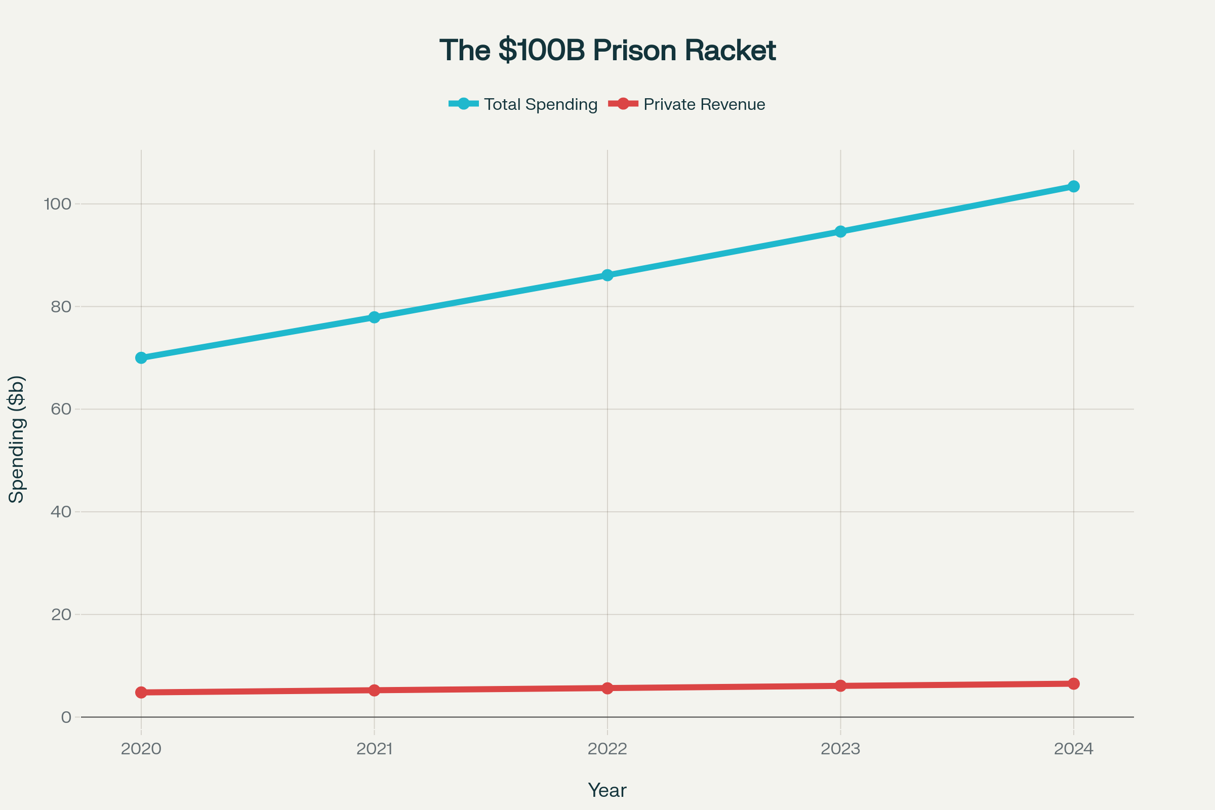 Growth in total US prison spending and private prison revenues, showing the massive scale of the carceral economy