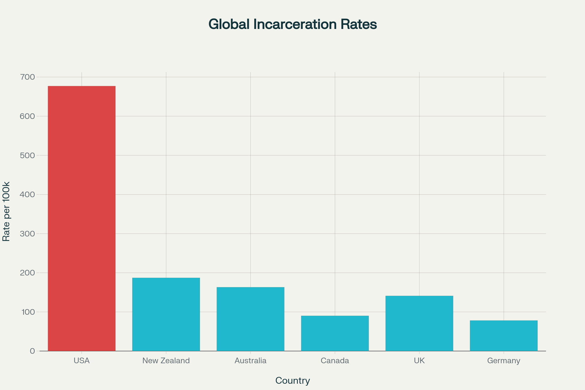 International comparison of incarceration rates per 100,000 population, highlighting America's massive prison population
