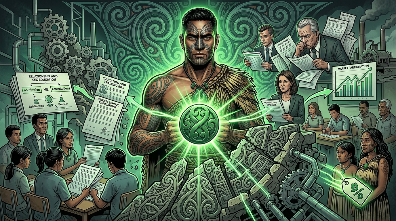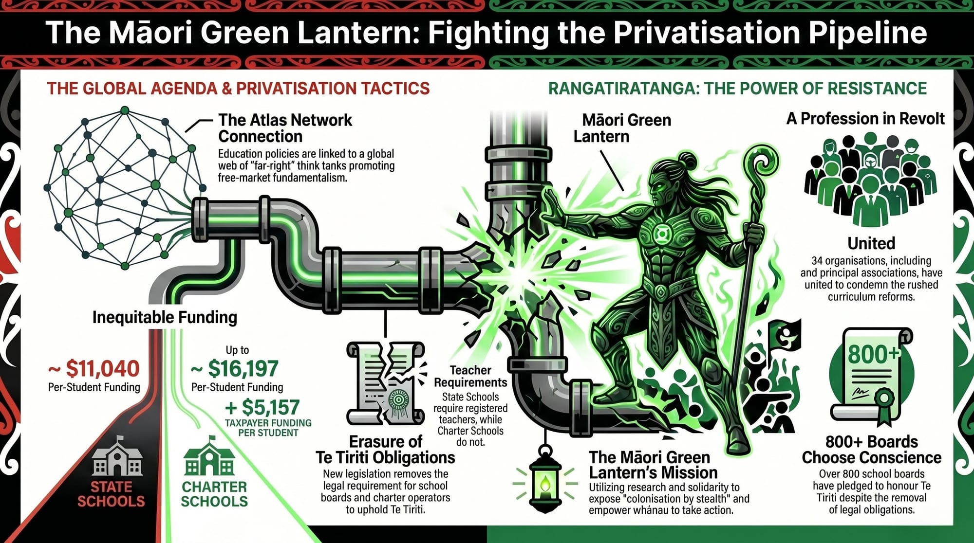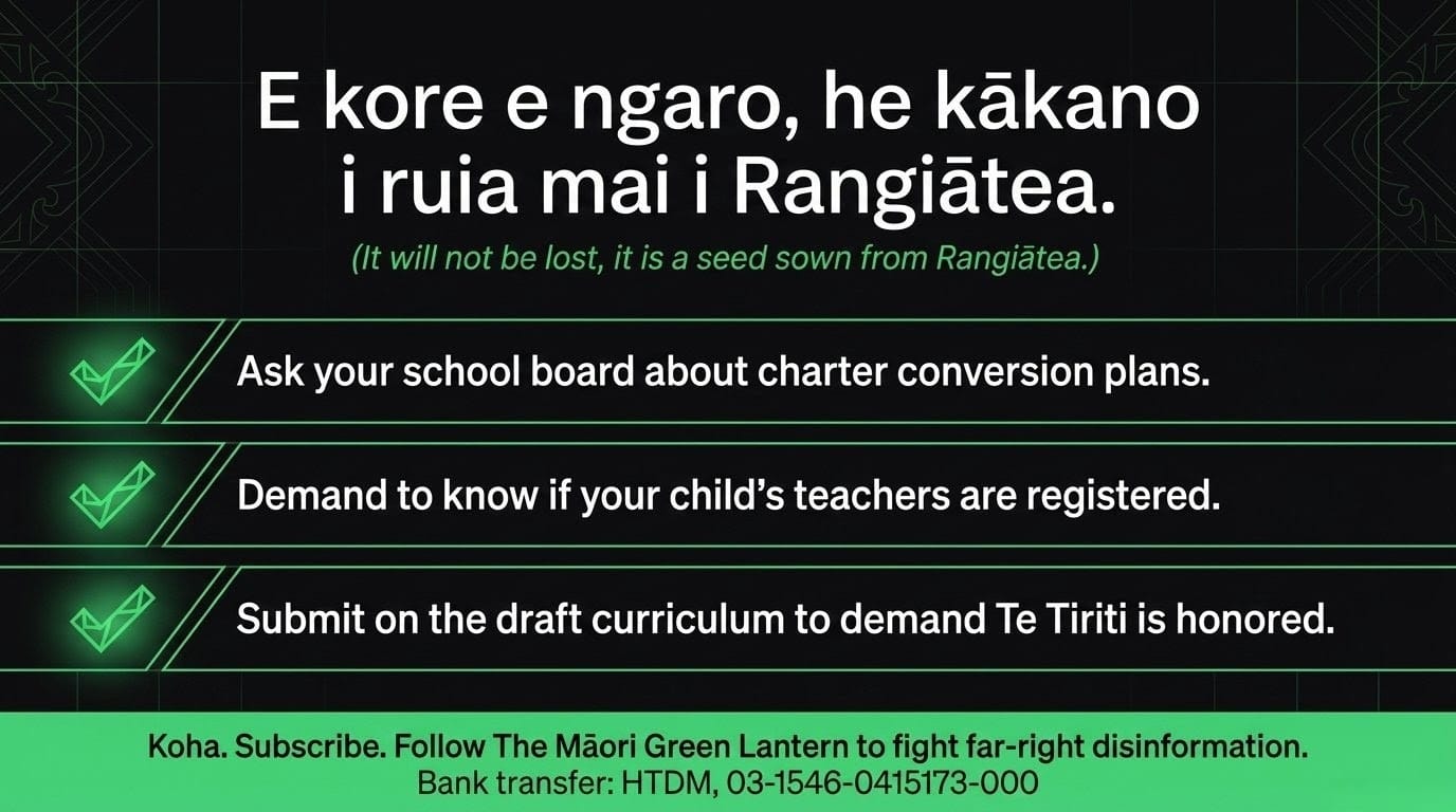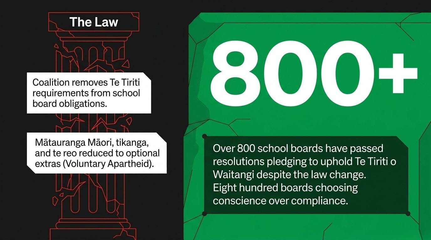 The resistance from within the sector has been extraordinary. As ODT's reporting on the 2026 education landscape confirms, over 800 school boards have passed resolutions pledging to uphold Te Tiriti despite the law change removing the obligation. Eight hundred boards chose conscience over compliance. The government counted on the profession rolling over. It miscalculated. The NZEI Te Riu Roa joint sector statement explicitly names "the demotion of te Tiriti o Waitangi and mātauranga Māori" as a central concern — not a side note, but a headline grievance. And as the Māori Green Lantern has documented, privatisation is colonisation by another name: the systematic extraction of wealth and mana from those who need protection most.