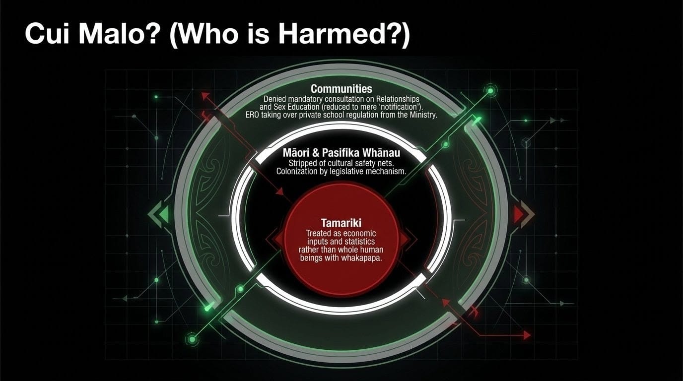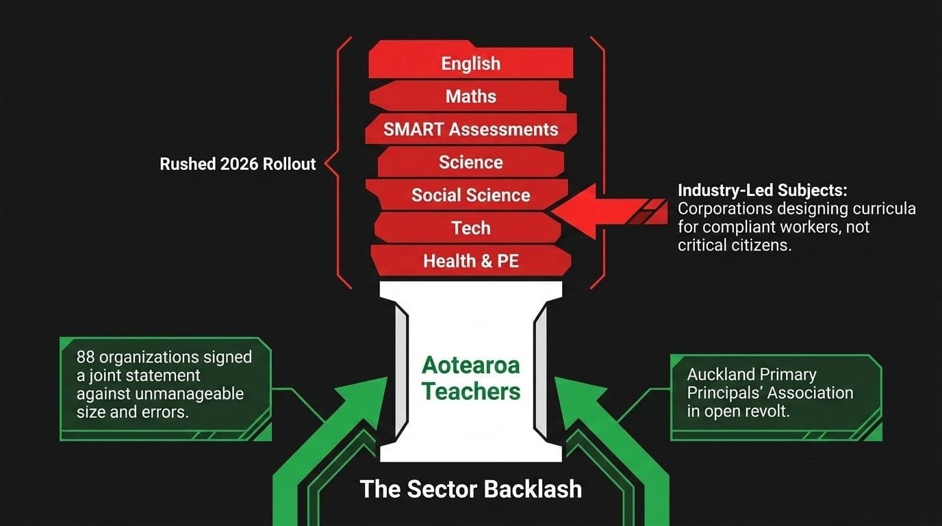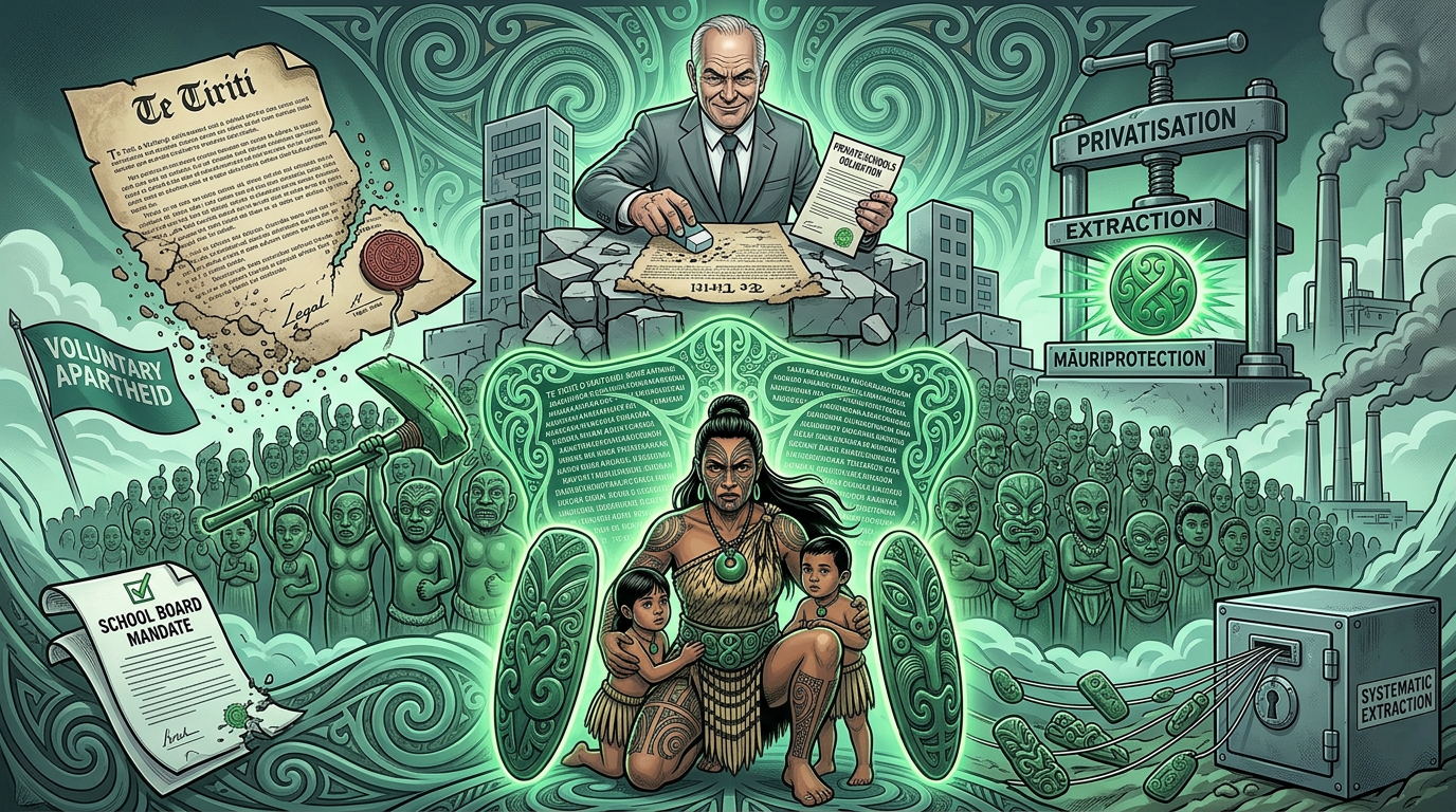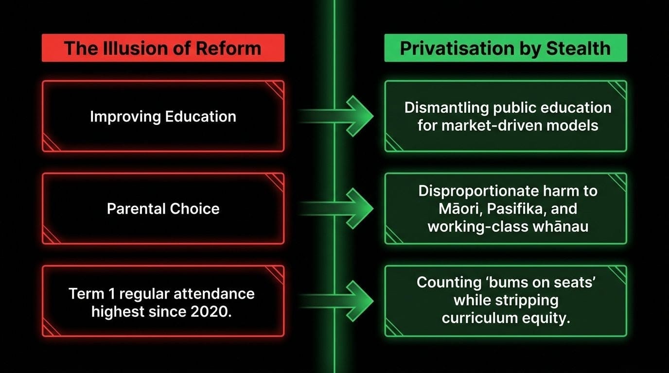 Every policy shift, every rushed curriculum change, every charter school conversion follows a single, coherent thread: the systematic dismantling of public education and its replacement with a market-driven model that will devastate Māori, Pasifika, and working-class whānau disproportionately.