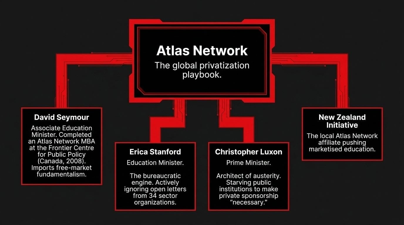 As documented by The Māori Green Lantern's Atlas Network investigation, and cross-referenced with the Māori Green Lantern's Ruth Richardson analysis, Seymour's training at the Frontier Centre placed him directly inside this network. The policies flowing from ACT — charter schools, curriculum marketisation, asset sales, removal of collective rights protections — mirror Atlas Network playbooks implemented in the United States, United Kingdom, Australia, and Chile, always with the same result: public institutions hollowed out, private profits extracted, and Indigenous and working-class communities left holding the debris. The New Zealand Initiative, the local Atlas Network affiliate, continues publishing policy papers advocating for school choice and marketised education — and its fingerprints are on every major reform in this government's education agenda.