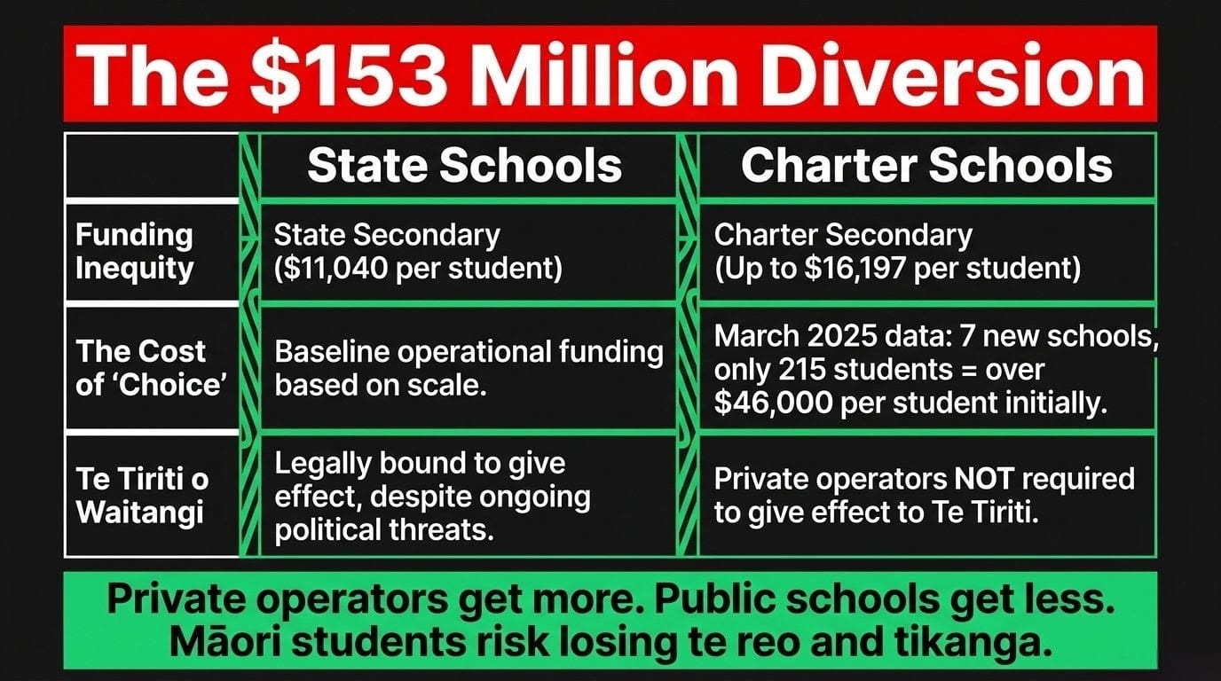 - Charter school funding inequity — small charter secondary schools funded at up to $16,197 per student against $11,040 for state secondaries, per the Beehive's own factsheet, while the public schools serving most Māori communities are relatively starved