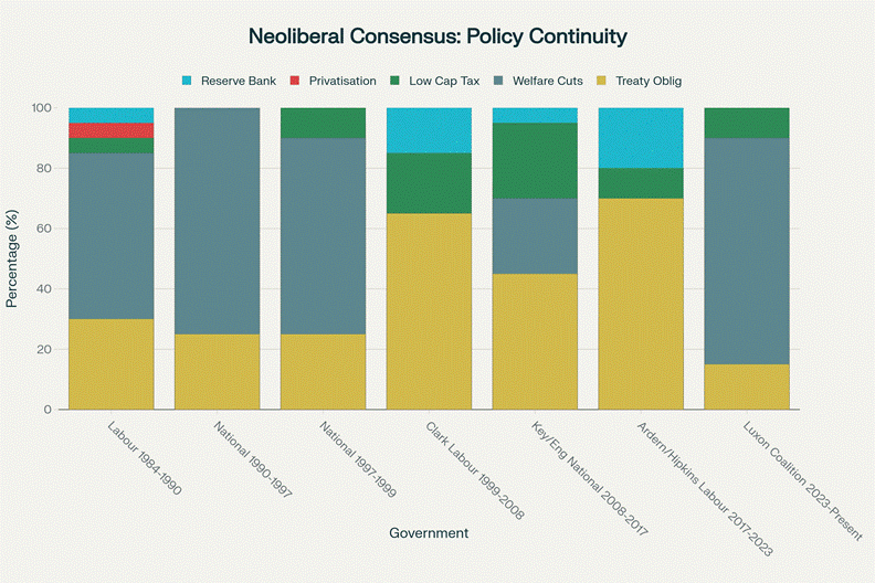 This chart reveals the uncomfortable truth: whether Labour or National governs, the fundamental neoliberal architecture remains intact. Reserve Bank independence, low capital taxes, and welfare restrictions persist across party lines, while Treaty obligations fluctuate based on political expedience.