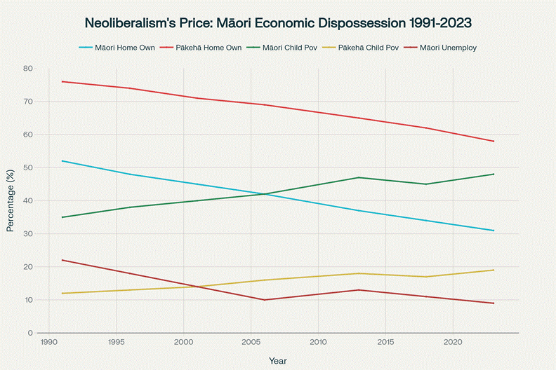 The devastating impact of neoliberal policies on Māori is undeniable. While both Māori and Pākehā home ownership has declined since Rogernomics, the gap has widened catastrophically. Māori child poverty has exploded from 35% to 48%, more than double the Pākehā rate.