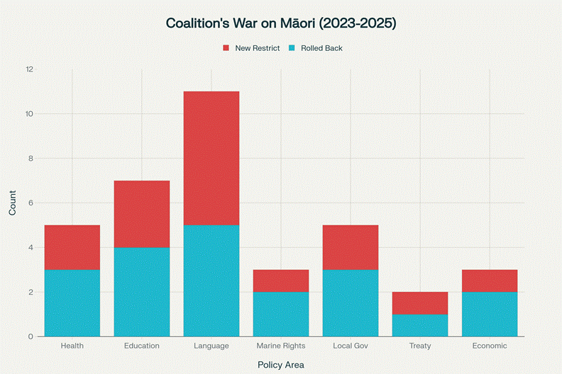 This chart documents the systematic dismantling of Māori rights under the current coalition. Language rights have been attacked with 11 total actions, education with 7, and health with 5. This is not policy adjustment - it is coordinated assault on tangata whenua.