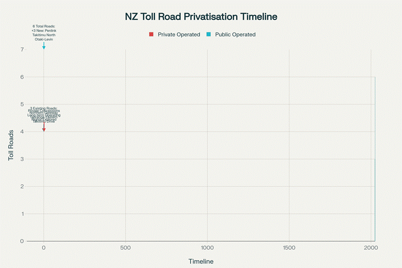 Currently, New Zealand has 3 toll roads, all publicly operated. By 2026, there will be 6 toll roads. The government is now explicitly considering private concessions for all future Roads of National Significance. This is a systematic privatisation of public infrastructure, executed quietly through technical policy rather than legislative fanfare.