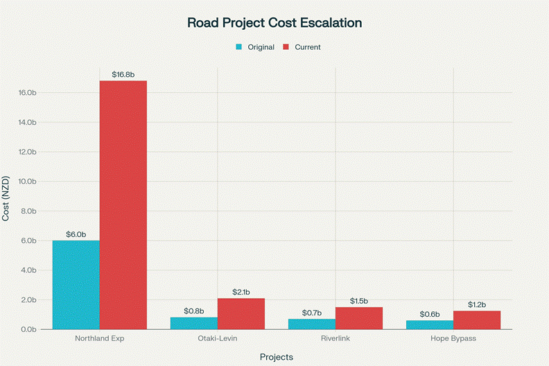 The Northland Expressway (Te Hana to Whangarei) was originally estimated at $6 billion for the entire four-lane corridor from Whangarei to Tauranga. But just the Te Hana to Whangarei section now costs $15.3-18.3 billion. The Otaki to North of Levin highway doubled from $817 million (2019) to $2.1 billion (2025). Lower Hutt’s Riverlink project more than doubled from $700 million to $1.5 billion. The Hope Bypass, just 4 kilometres long, costs $1.1-1.4 billion.