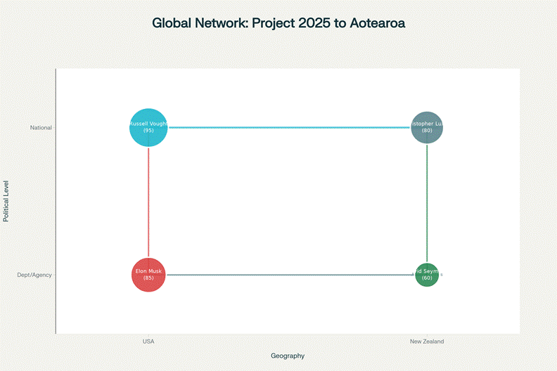 The pattern is undeniable: Vought designs the blueprint in Project 2025. Musk executes it in the federal government. Trump provides political cover and protection from courts. Seymour imports the same playbook to New Zealand. Luxon provides the corporate credibility and political capital.