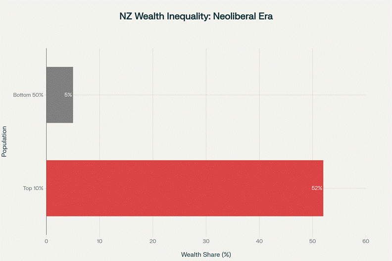Wealth concentration in New Zealand has reached extreme levels under four decades of neoliberal policies, with the top 10% controlling more than half of all wealth while the bottom 50% struggle with just 5%.