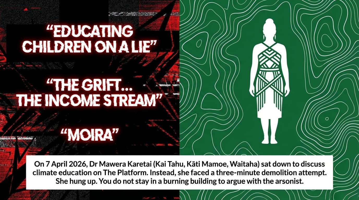 On 7 April 2026, Dr Mawera Karetai — project lead, climate educator, Kai Tahu, Kāti Mamoe, Waitaha — sat down to speak with Sean Plunket on The Platform about climate change education in schools. She never got the chance. What followed was not journalism. It was not skepticism. It was an ambush — a three-minute demolition attempt dressed up as an interview, executed by a man whose Broadcasting Standards Authority record tells you everything you need to know about his relationship with Māori voices.