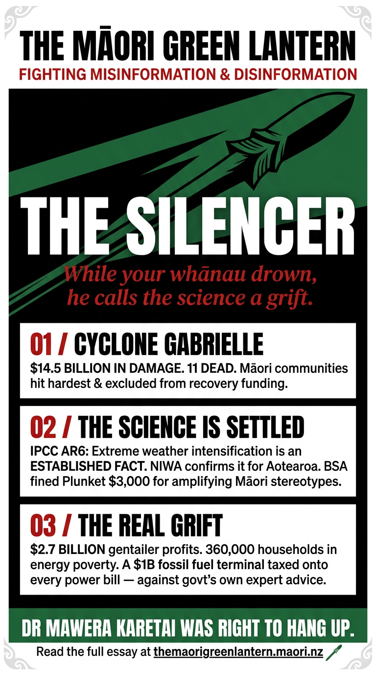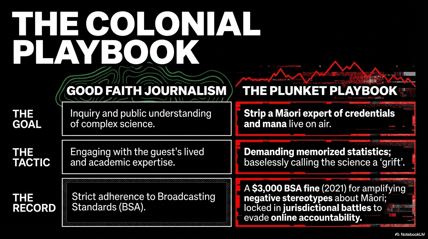 Plunket is not brave. He is not provocative. He is a man with a microphone and a BSA record, serving an ideological function for a government that cannot afford for climate science to reach Māori children without being first discredited. His ambush of Dr Karetai was not journalism. It was an act of epistemic violence — the deliberate, public destruction of a knowledge holder's credibility in service of a political agenda that will cost whānau lives.