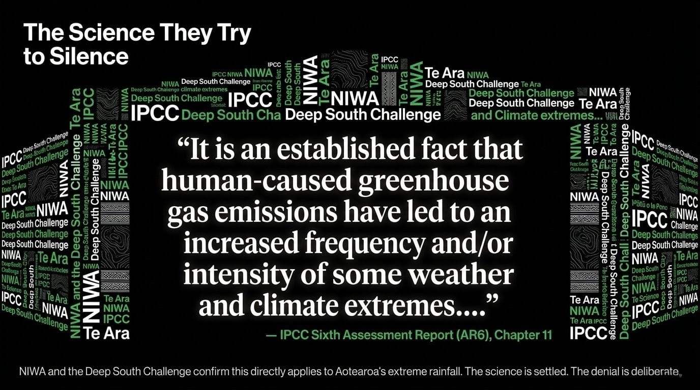 The IPCC says it. NIWA says it. The Deep South Challenge says it. Te Ara says it. The science is not missing. It is inconvenient — to The Platform, to The Luxon Government, and to the fossil fuel economy they are both defending.ipcc+3