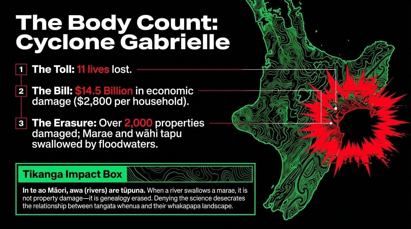 In February 2023, Cyclone Gabrielle struck Aotearoa with a ferocity that the Ministry for the Environment directly attributed to intensification by climate change. It killed 11 people. It caused over $14.5 billion in economic damage — roughly $2,800 per New Zealand household. In Hawke's Bay alone, over 2,000 properties were damaged or destroyed. Māori communities were disproportionately impacted: Ngāti Pāhauwera, Ngāti Kahungunu, and other hapū in Esk Valley and Te Whanganui-a-Orotū lost marae, wāhi tapu, and irreplaceable cultural infrastructure. The Cyclone Recovery Independent Monitoring Group found Māori faced systemic barriers in accessing recovery funding — barriers that compounded existing Crown neglect.