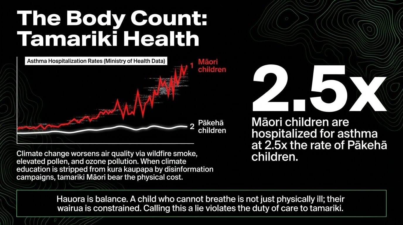The Tikanga impact: In tikanga, hauora — health — is not the absence of disease. It is the balance of te taha wairua (spiritual dimension), te taha hinengaro (mental dimension), te taha tinana (physical dimension), and te taha whānau (family dimension). A child who cannot breathe is not just physically ill. Their wairua is constrained. Their ability to participate in whānau, in hapū, in the life of the community is diminished. Climate harm is tikanga harm. Calling it a lie is a violation of the duty of care that every adult holds toward tamariki.