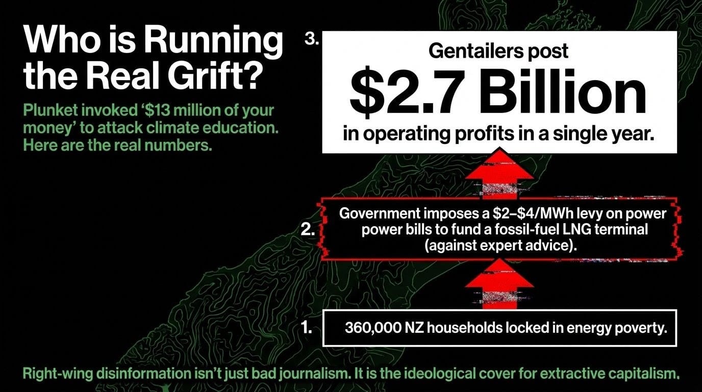 Sean Plunket gets a studio, a broadcast infrastructure, and the ideological backing of a neoliberal media ecosystem to call your climate educators liars. Dr Karetai gets hung up on. That asymmetry is not accidental — it is funded.