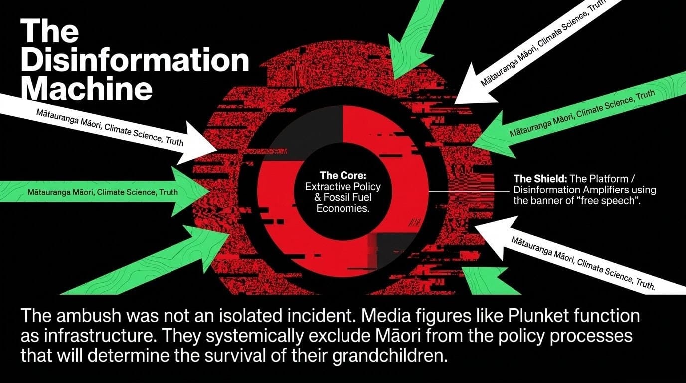 The Platform is not a media organisation in any meaningful sense. It is a disinformation amplifier that has consistently platformed climate denial, anti-Māori rhetoric, and anti-science talking points under the banner of "free speech." Its founding backer, Wayne Wright Jr., exited in 2025. Its broadcasting standards accountability remains contested as the BSA fights to establish jurisdiction over online content. Without accountability, there is no floor. Every Māori guest who appears on The Platform does so at the risk of exactly what happened to Dr Karetai: a pre-planned ambush designed to generate a clip, not a conversation.