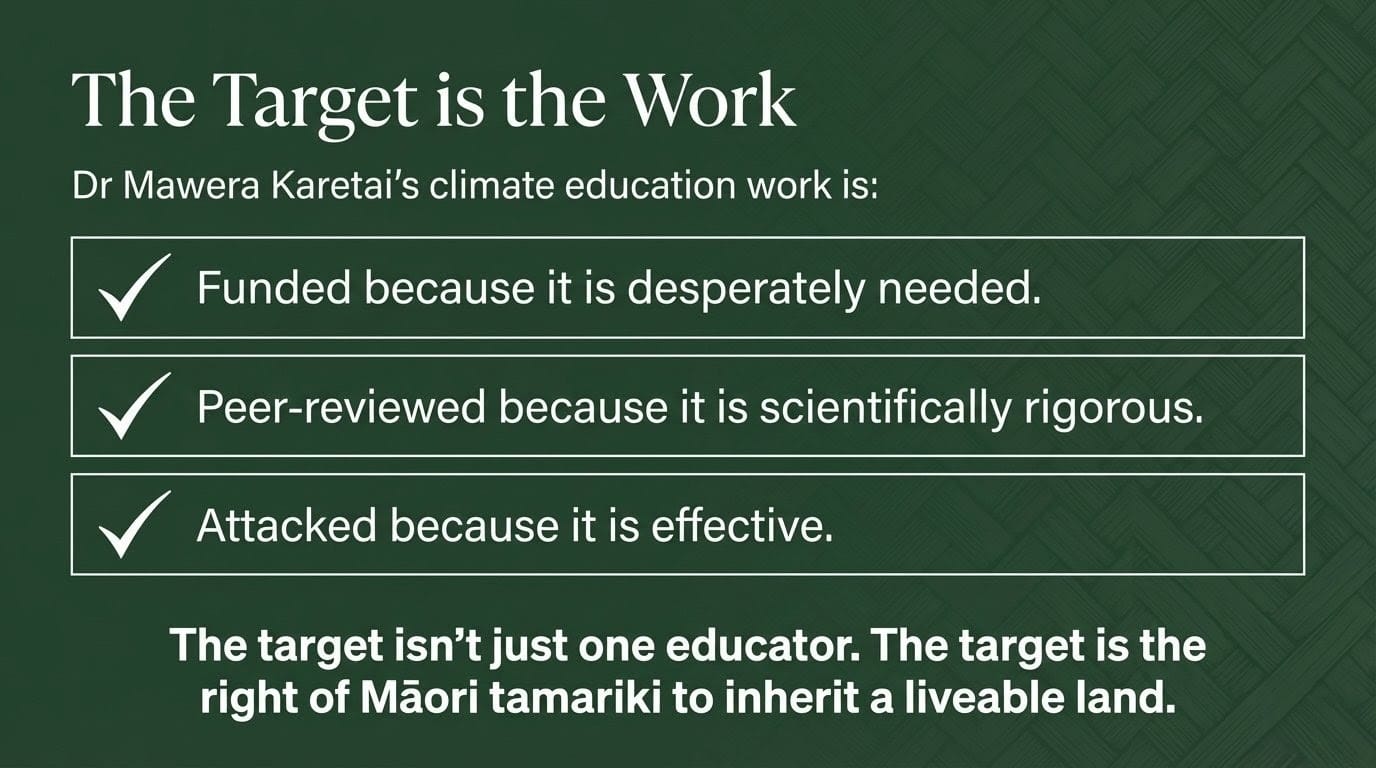 Dr Mawera Karetai (Kai Tahu, Kāti Mamoe, Waitaha) is the project lead for a climate change education initiative reaching New Zealand schools. The work she leads is funded because it is needed, peer-reviewed because it is rigorous, and attacked because it is effective. The children she is trying to reach are the same children who will inherit Cyclone Gabrielle's successor — a storm that will be worse, not better, because the Plunkets of this world spent 2026 calling the science a grift instead of asking how we protect tamariki.