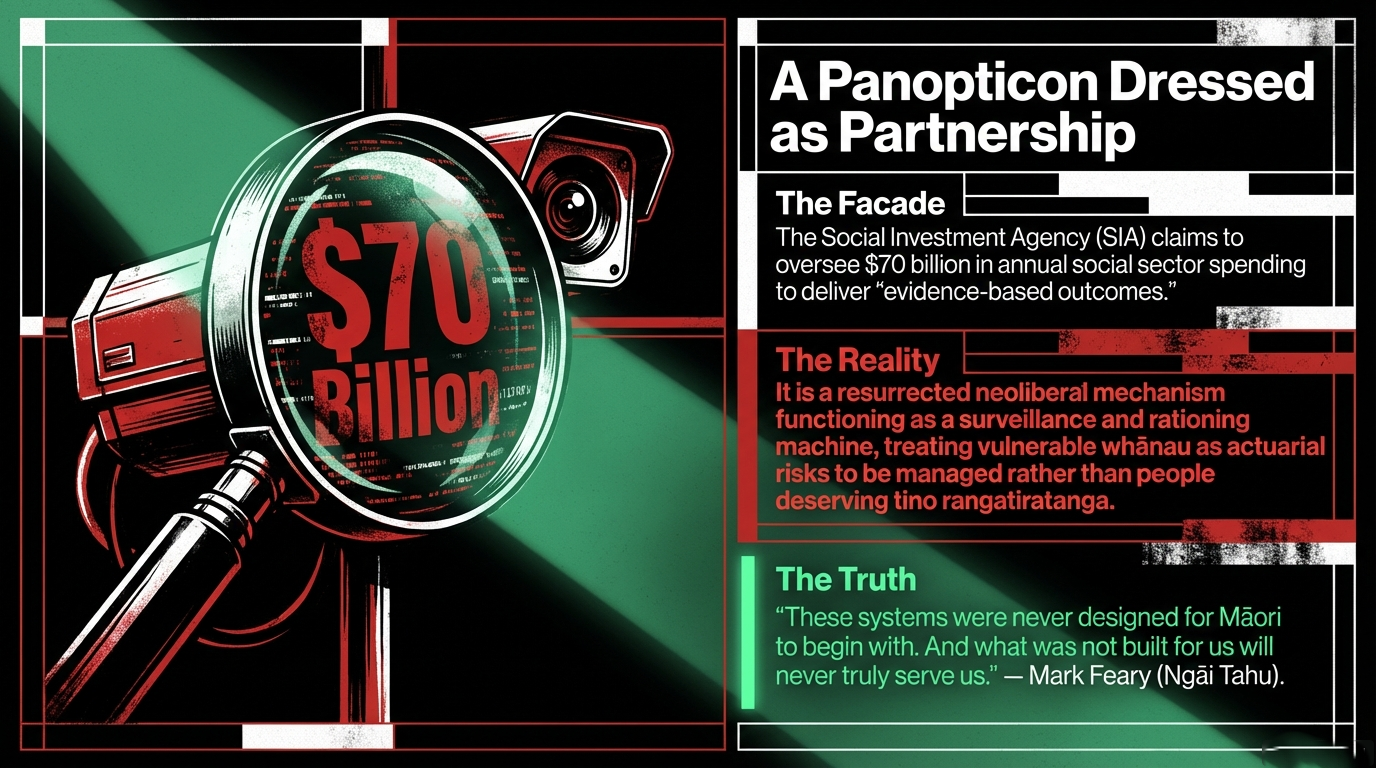 The social investment model does not address the material drivers of inequality — housing, wages, structural racism, Crown breaches of Te Tiriti. It offers instead a panopticon: watch the whānau closely, measure their outcomes, fund the interventions that reduce their cost to the Crown. As Mark Feary wrote in E-Tāngata: "The systems of government aren't malfunctioning — they're serving the purpose they were built for."