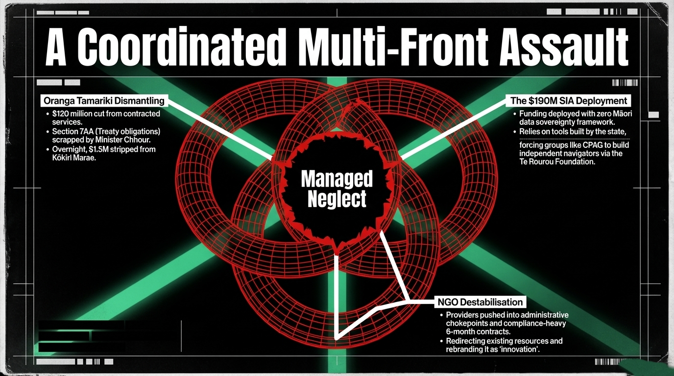 While the SIA promises early intervention, Oranga Tamariki continues its catastrophic failure of Māori tamariki. As the Green Party confirmed in June 2025, Māori youth make up two-thirds of those in state care and almost 50% of reports of concern to OT. Intergenerational cycles persist: 70% of Māori parents who were in care now have children involved with OT. Minister Chhour scrapped Section 7AA — which required OT to give effect to Te Tiriti — and cut $120 million from contracted services supporting vulnerable youth. Kōkiri Marae lost $1.5 million overnight. The SIA claims to be building early intervention while this government simultaneously demolishes the infrastructure that makes early intervention possible. This is not contradiction. This is coordinated assault.