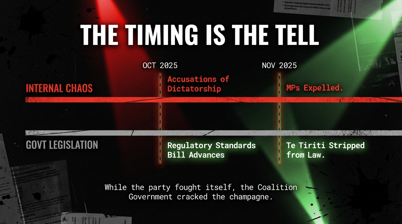 Every major escalation in Te Pāti Māori's internal crisis coincided with critical moments in the coalition government's anti-Māori legislative programme. While the party was consumed by accusations of "dictatorship" in October 2025, the Regulatory Standards Bill—which the Waitangi Tribunal warned breaches Treaty principles—was advancing through Parliament. While the expulsions dominated headlines in November, the government was quietly stripping Te Tiriti references from legislation across multiple policy areas. Corporate media devoted thousands of column inches to Māori political infighting while barely covering the most systematic attack on indigenous rights in a generation.